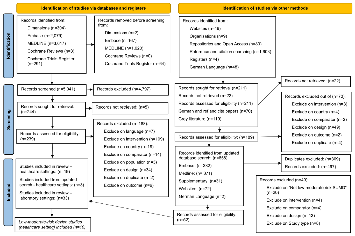 A systematic review was conducted [11] and reported according to the Preferred Reporting Items for Systematic Reviews and Meta-Analyses (PRISMA) criteria [12], [13]. Where appropriate, procedures were consistent with guidance on systematic reviews with cost and cost-effectiveness outcomes [14]. The original study protocol was registered on the International Prospective Register of Systematic Reviews (PROSPERO) (ID: CRD42022365642). In this article, we present the results of human studies of risk class I and II SuMDs only. A report of risk class III devices has been published already [15].