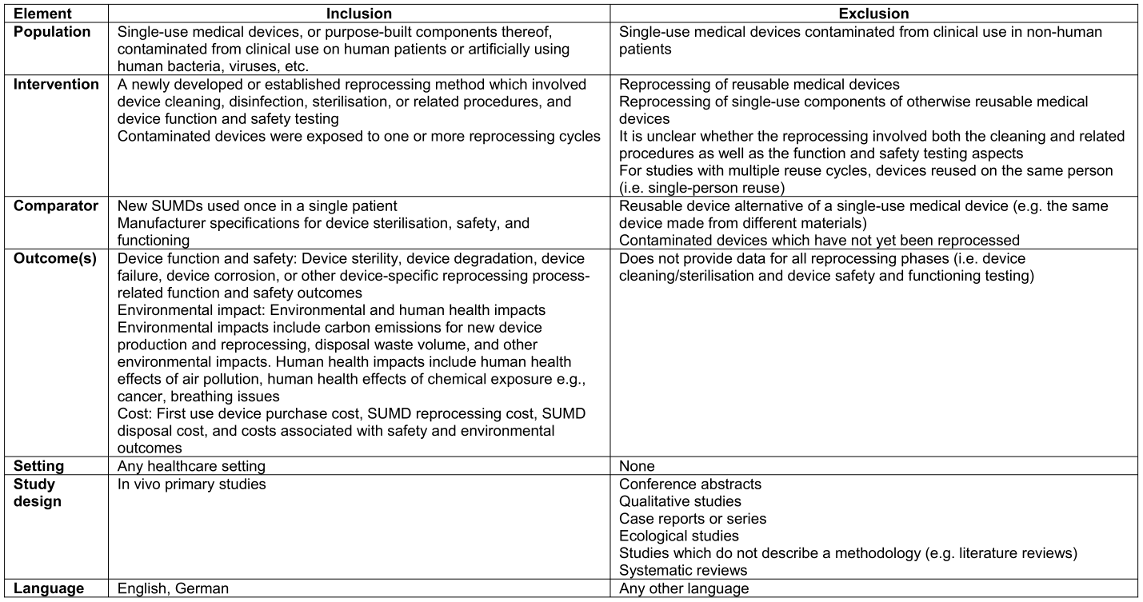 The eligibility criteria were defined using the Population Intervention Comparison Outcomes Study design (PICOS) framework (Table 1 [Tab. 1]). SuMDs included devices and purpose-built components thereof exposed to human cells, bacteria and/or viruses. Reprocessing was defined using European legislation as “a process carried out on a used device in order to allow its safe reuse, including cleaning, disinfection, necessary sterilisation and related procedures, as well as testing and restoring the technical and functional safety of the used device” [16], with a similar definition employed in medical device research [17]. To ensure health system comparability, primary studies of any healthcare facility using reprocessed SuMDs in Organisation for Economic Co-operation and Development (OECD) or EU member states only were eligible. Studies must have included at least one type of primary outcome of interest and compared outcomes with first use of the same SuMD. We did not include systematic review studies as we were uncertain that the evidence included in the reviews would reflect reprocessing as defined in our study [7], [8].