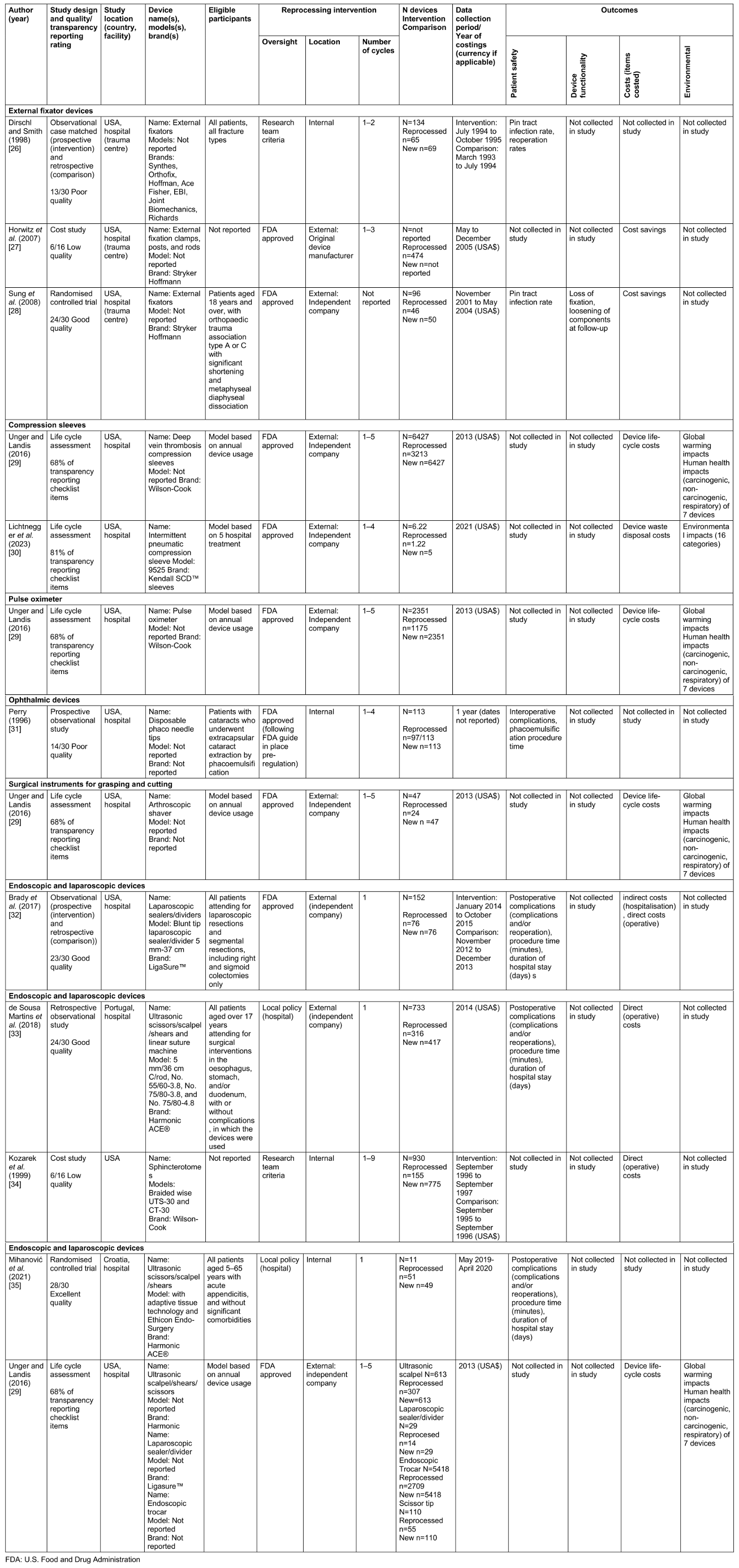 Safety outcome data were available for external fixator devices; ophthalmic devices; and endoscopic and laparoscopic devices. Cost outcomes were available for all device types, except for ophthalmic devices. Environmental outcomes were available for: compression sleeves; pulse oximeters; surgical instruments for grasping and cutting; and four endoscopic and laparoscopic devices.