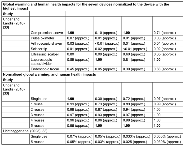 In their one-to-one device comparison (i.e. exclusion of annual device use), Unger and Landis [29] reported the following relative global warming and human health outcomes: carcinogenic, non-carcinogenic and respiratory impacts. Of the devices studied, the compression sleeve had the highest global warming and non-carcinogenic impacts, and the laparoscopic sealer/divider had the highest carcinogenic and respiratory impacts [29]. Device impacts, normalised to the device with the highest impact for each outcome, are reported in Table 4 [Tab. 4]. When accounting for annual use of all seven devices using median/mean reprocessing lifecycle inventory inputs, reprocessing resulted in a reduced and normalised global warming impact with each additional reprocessing cycle compared to single device use. When accounting for annual use of all seven devices using median/mean reprocessing lifecycle inventory inputs, reprocessing resulted in increased normalised carcinogenic, non-carcinogenic and respiratory impacts with each additional reprocessing cycle compared to single device use (Table 4 [Tab. 4]). In the study by Lichtnegger et al. [30], results related to the product contribution to ecological footprint of a person across the 4 impact domains. The authors reported reduced environmental contribution of the reused versus the new devices across all impact domains (Table 4 [Tab. 4]). They further quantified the reduction in global warming potential (kg CO2eq) of 7.0 for single use to 4.2 for treatment of five patients using reprocessed devices.