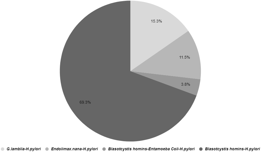 This study revealed that co-infections of H. pylori and intestinal parasites were present in 10.8% of participants (Table 1 [Tab. 1]). The distribution of H. pylori co-infection with various intestinal parasites is illustrated in Figure 1 [Fig. 1]. Co-infection with Blastocystis and H. pylori was observed in 69.3% of cases, making it the most prevalent combination among the study participants (Figure 1 [Fig. 1]).