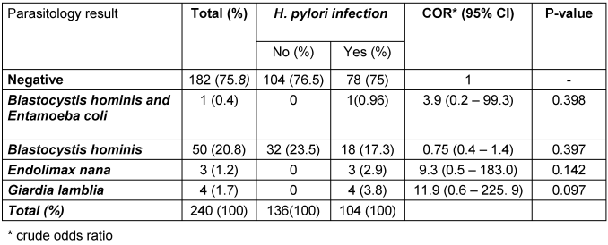 Associated factors of H. pylori and intestinal parasite co-infection