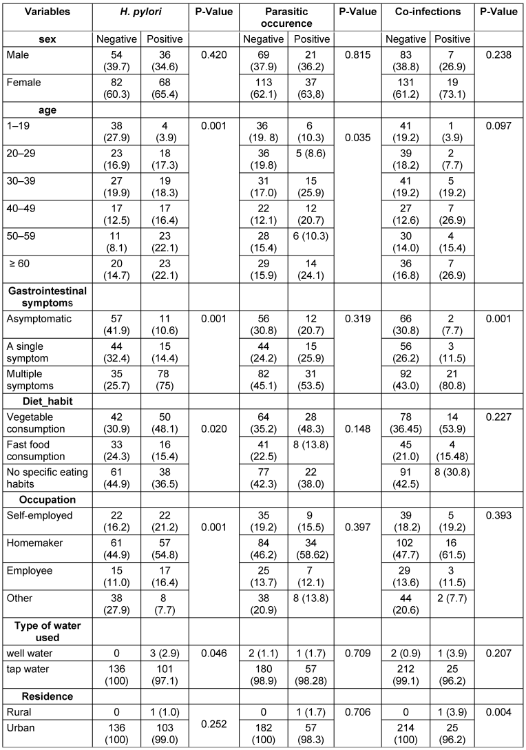 Table 2: Association between intestinal parasites, H. pylori, and co-infections status with demographic and lifestyle factors