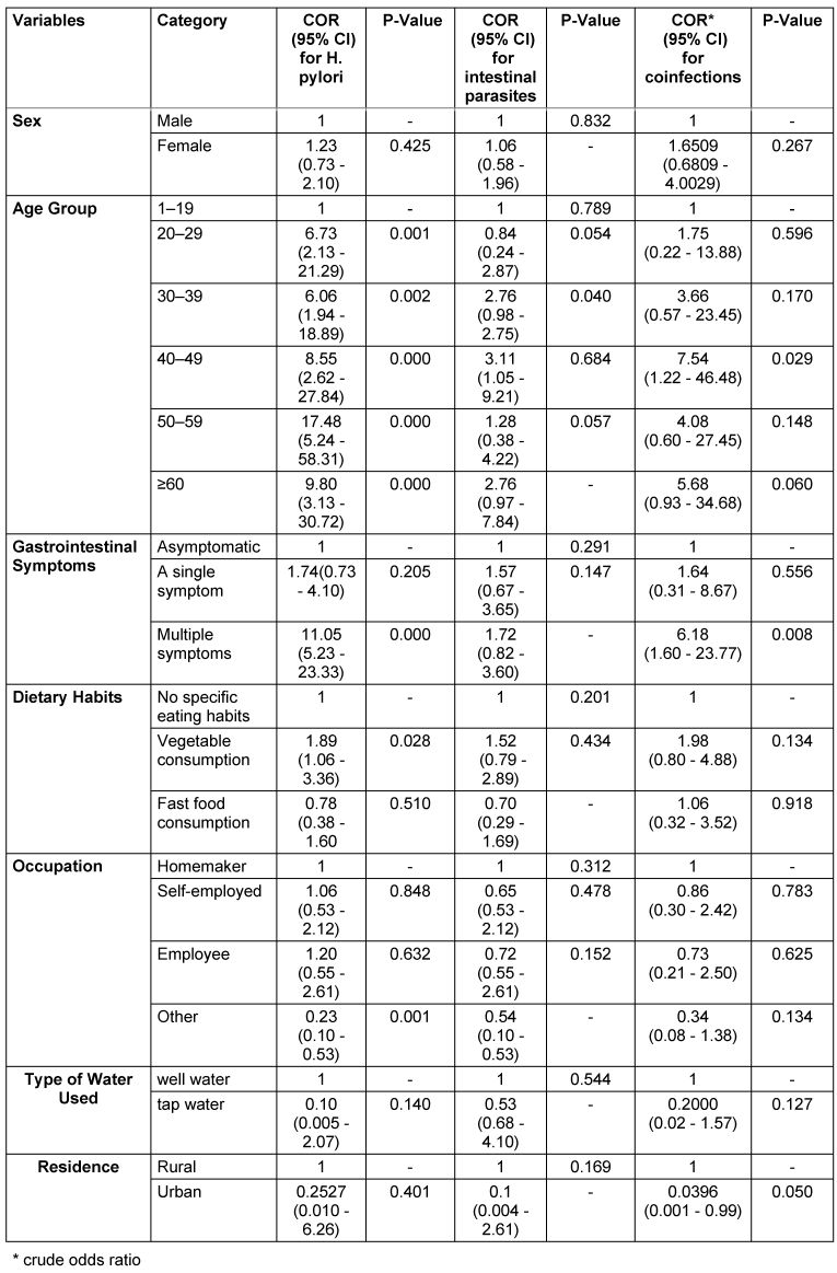 Table 3: Regression analysis of factors related to H. pylori and intestinal parasite co-infection