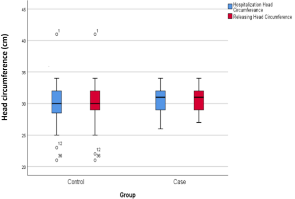 At admission, the mean head circumference of the two groups (intervention group: 30.56±1.83, control group: 30.20±2.95) did not show a statistically significant difference. Similarly, the mean head circumference of the two groups (intervention group: 30.65±1.77, control group: 30.32±2.92) at discharge did not demonstrate a statistically significant difference (Figure 1 [Fig. 1]).