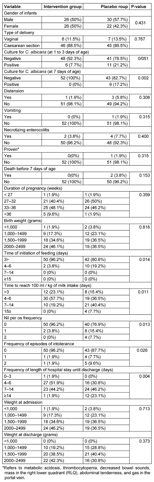 The results of culturing C. albicans from stool samples in infants aged 1 to 3 days before intervention in the intervention and control groups were 4 (7.7%) and 11 (21.2%), respectively, indicating a noticeable but not statistically significant decrease in the intervention group.