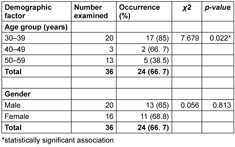 The overall prevalence of H. pylori in this dyspeptic cohort was 66.7% (24 out of 36 patients) (Table 1 [Tab. 1]). A significant association was found between age group and H. pylori occurrence (Χ²=7.679, p-value=0.022). The infection rate was highest in the 30–39 years age group (85%, 17 out of 20), followed by the 40–49 years group (66.7%, 2 out of 3). The lowest prevalence was observed in the 50–59 years age group (38.5%, 5 out of 13). In contrast, no statistically significant association was found between gender and H. pylori infection (Χ²=0.056, p-value=0.813).