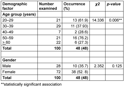 Table 2 [Tab. 2] presents the distribution of H. pylori prevalence in stool specimens from gastritis patients, stratified by age and gender (n=100). The overall infection rate was 48%. A statistically significant association was observed between age and H. pylori positivity (Χ²=14.336, p=0.006). The highest prevalence occurred in the 50–59 years age group (76.2%; 16/21), followed closely by the 20–29 years group (61.9%; 13/21). In contrast, the lowest rate was recorded among patients aged 60 years and older (27.3%; 6/22). Regarding gender, prevalence was higher among females (52.8%; 38/72) than males (35.7%; 10/28), although complete statistical details for this comparison were not specified in the table.