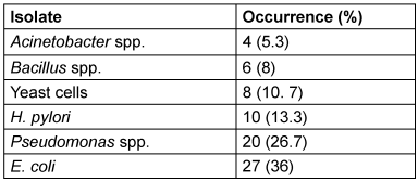 Table 3: Occurrence of H. pylori and other organisms in dyspeptic and gastric patients (n=75)