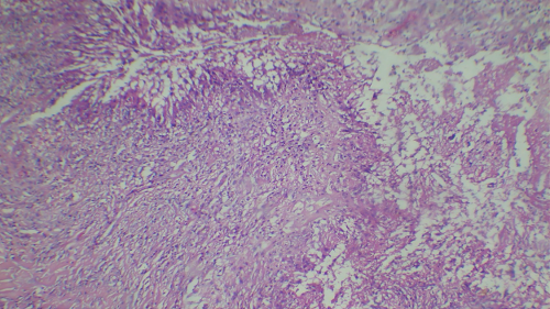 Figure 3: Hematoxylin and Eosin staining (40x) showing a necrotizing lesion with palisading granulomas containing giant cells