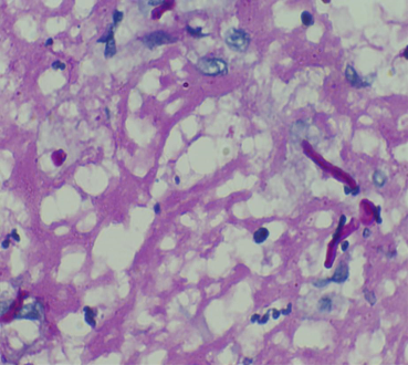 Figure 4: PAS-D staining (400x) showing branching, septate fungal hyphae
