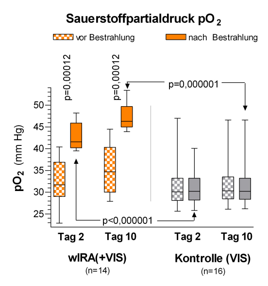 (dargestellt mit Minimum, 25%-Perzentile, Median, 75%-Perzentile und Maximum (Box-Whiskers-Darstellung; die Box repräsentiert die Interquartil-Spanne); adaptiert aus [2], [19]). Während der Bestrahlung mit wIRA(+VIS) stieg der subkutane Sauerstoffpartialdruck deutlich um mehr als 30% an, während er in der Kontrollgruppe unverändert blieb.