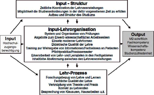 Auf einer Mikroebene können hingegen vielfältige organisatorische Bedingungen einen Einfluss auf die Qualität der Lehre nehmen (Input-Lehrorganisation). Hierzu zählen u.a. Personalentwicklungsmaßnahmen wie medizindidaktische Angebote oder Einführung eines Lernzielkatalogs. Diese Bedingungen können sowohl durch die Fakultäten als auch durch die Lehrenden gesteuert werden. Der Bereich Lehr-Prozess schließlich beinhaltet Faktoren, die sich primär im Lehr-Lernprozess zwischen Lehrenden und Studierenden ergeben. Der Einfluss dieser drei Bereiche auf den Studienerfolg wurde im Rahmen dieser Arbeit untersucht.