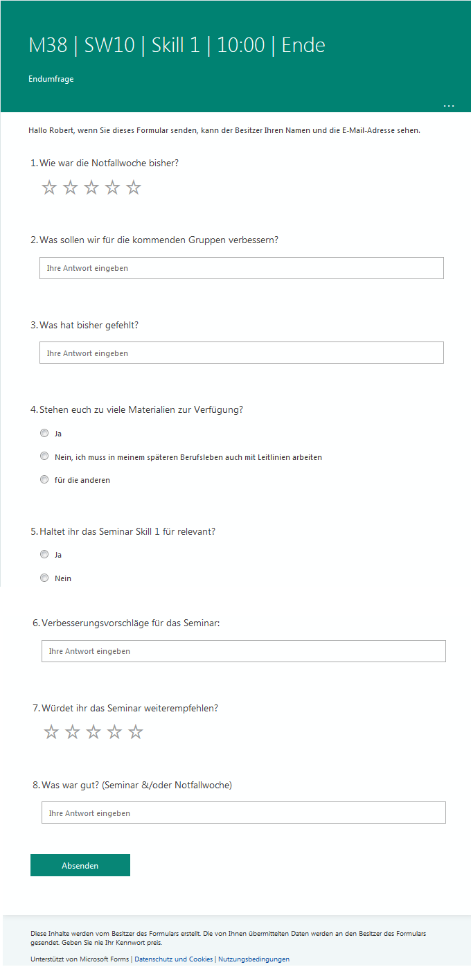 Am Ende führten wir eine weitere Umfrage bei Forms durch, in der wir sie nach ihrer Meinung zum Seminar und zum parallel stattfindenden Notfallmedizin-Kurs fragten (siehe Anhang 2 [Anh. 2]).