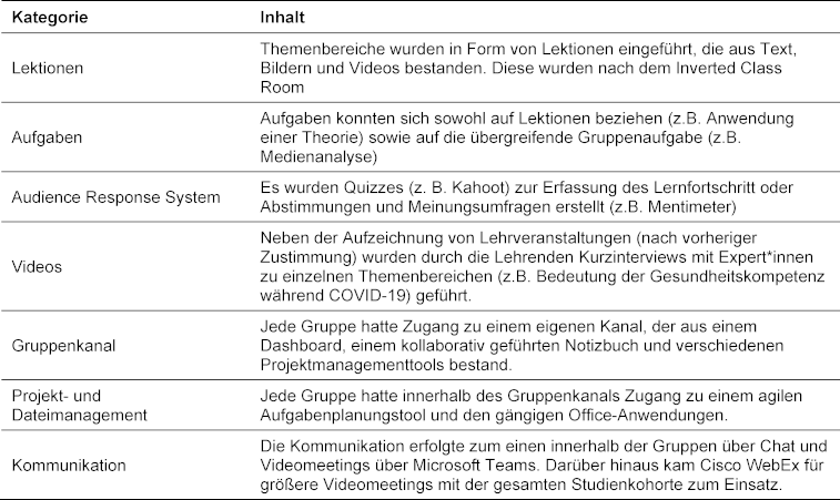 Infolge der coronabedingten Schließung der Hochschule erfolgte die Umsetzung der Veranstaltung ausschließlich digital und erstmals unter Verwendung der Plattform Microsoft (MS) Teams. Hauptgründe für diese Plattform waren vor allem zahlreichen Möglichkeiten der Kollaboration und der Nutzung verschiedener Kommunikationstools (siehe Tabelle 1 [Tab. 1]). Während die Anfangsphase aufgrund befürchteter Netzprobleme eher durch asynchrone Lehr- und Lernszenarien geprägt war (Lektionen, Videos), konnten im Semesterverlauf zunehmend synchrone Formate über Microsoft Teams und Cisco WebEx integriert werden (Gruppenmeetings, Besprechungen von Lehrinhalten). Daneben wurde das Online Inverted-Classroom-Modell angewendet [9]. Dabei mussten die Studierenden Online-Selbstlernphasen zur Vermittlung von Faktenwissen absolvieren. Diese Inhalte wurden in einer anschließenden synchronen Session von den Studierenden angewendet und gemäß der Bloomschen Taxonomie [10] vertieft. Um die Aktivierung der Studierenden nach dem ICAP Modell [11] zu fördern, wurde auf Audience Response Systeme wie z. B. Kahoot! [12] zurückgegriffen.