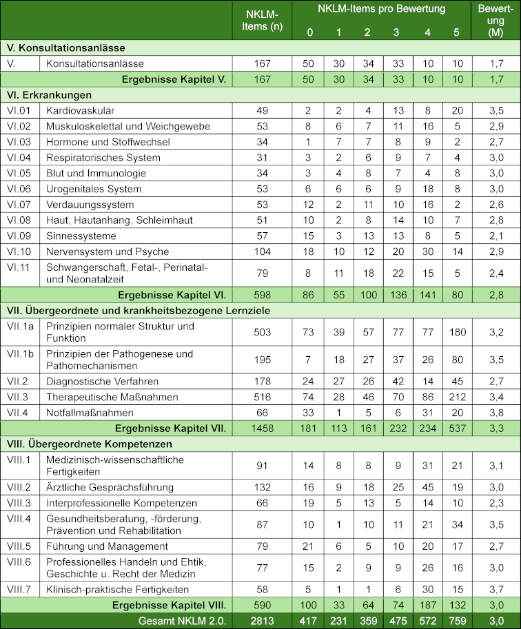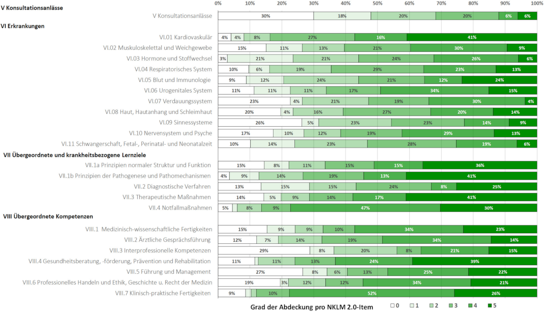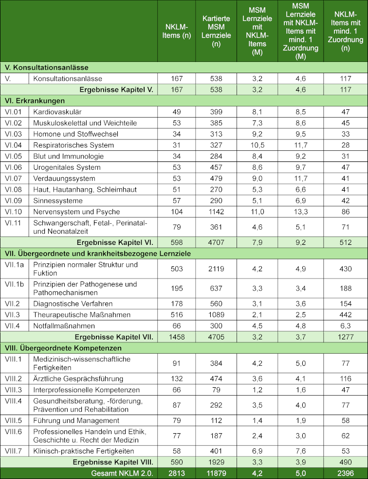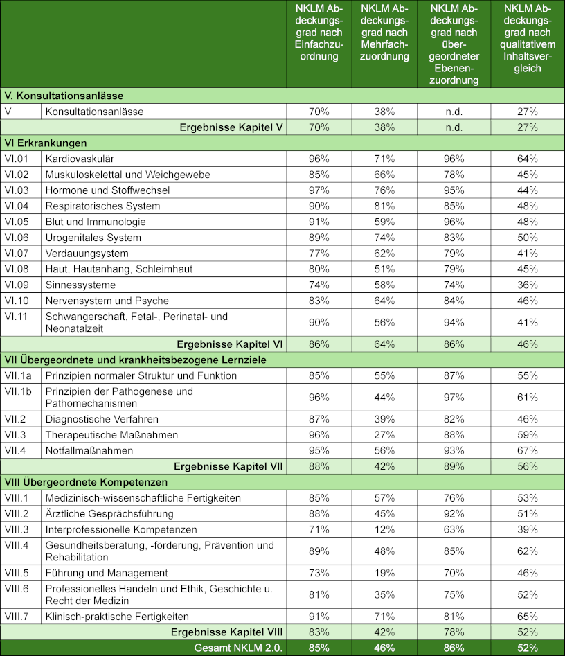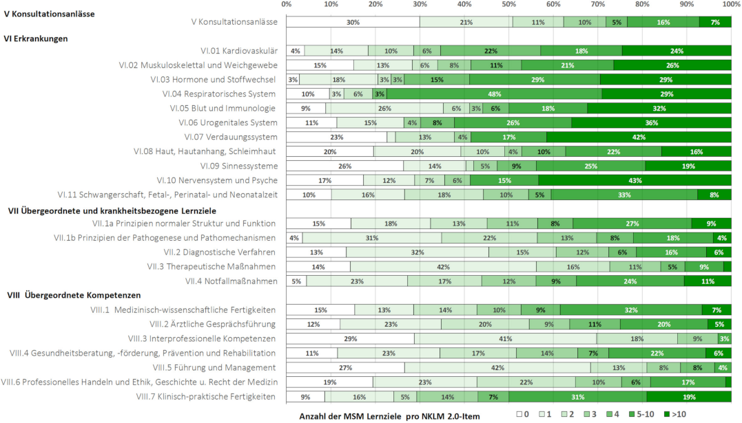 Der Grad der qualitativ-inhaltlichen Abdeckung der NKLM 2.0-Items durch die MSM-Lernziele variierte zwischen den NKLM-Kapiteln. Der niedrigste Wert wurde in Kapitel V (Konsultationsanlässe) und der höchste in Unterkapitel VII.4 (Notfallmaßnahmen) verzeichnet.
