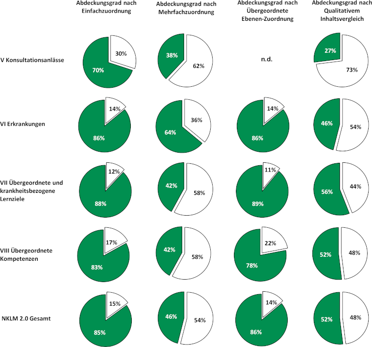 Abbildung 3: Übersicht über die Abdeckungsgrade des Nationalen Kompetenzbasierten Lernzielkatalogs Medizin 2.0 (NKLM) insgesamt und nach Kapiteln auf Grundlage der Kartierung der Lernziele des Modellstudiengangs Medizin (MSM) anhand der vier Zuordnungsverfahren: Einfachzuordnung, Mehrfachzuordnung, Übergeordnete Ebenen-Zuordnung und qualitativer Inhaltsvergleich (n.d.=nicht definiert). Die grünen Bereiche zeigen den geschätzten Abdeckungsgrad.