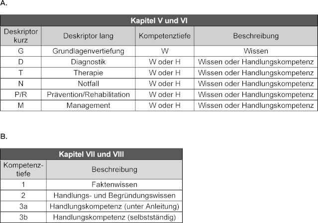 Tabelle 1: Deskriptoren und Kompetenztiefen, die im Nationalen Kompetenzbasierten Lernzielkatalog Medizin 2.0 (NKLM) verwendet werden. Es gibt zwei Systeme, eines für die Kapitel V und VI (A) und eines für die Kapitel VII und VIII (B). Der Buchstabe W steht für „Wissen“ und der Buchstabe H „Handlungskompetenz“.