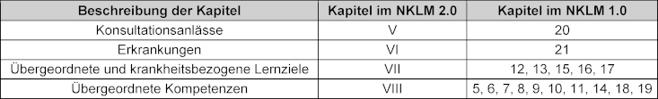 Im Zuge der Entwicklung des NKLM 2.0 wurde die Struktur des NKLM 1.0 überarbeitet. Tabelle 2 [Tab. 2] stellt die entsprechenden Kapitel beider Versionen gegenüber [https://nklm.de/zend/menu].