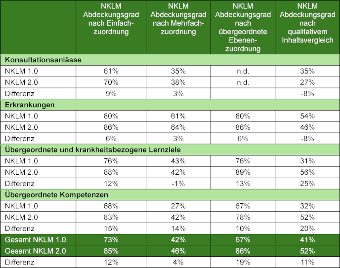 Methoden: Ein zweistufiger Prozess wurde zur Ermittlung des curricularen Abdeckungsgrads verwendet. Zunächst wurden die Lernziele des MSM mithilfe der Curriculum-Management-Plattform LOOOP den Items des NKLM 2.0 zugeordnet. Anschließend wurde der Abdeckungsgrad des NKLM 2.0 durch den MSM mithilfe von drei quantitativen Ansätzen und einem qualitativen Ansatz (Inhaltsvergleich) berechnet. Abschließend wurden die Ergebnisse der NKLM 2.0-Abdeckung mit den Ergebnissen der vorherigen NKLM 1.0-Kartierung verglichen.