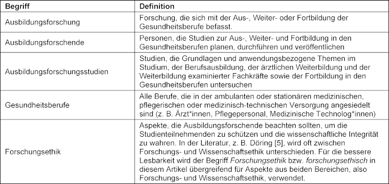 Bei der Planung, Durchführung und Publikation von Ausbildungsforschungsstudien in den Gesundheitsberufen sind neben geltenden Gesetzen auch forschungsethische Aspekte zu beachten Die zentralen Begrifflichkeiten des in diesem Artikel behandelten Themas können unterschiedlich verstanden werden. Wir verwenden die Begriffe wie in Tabelle 1 [Tab. 1] aufgeführt.
