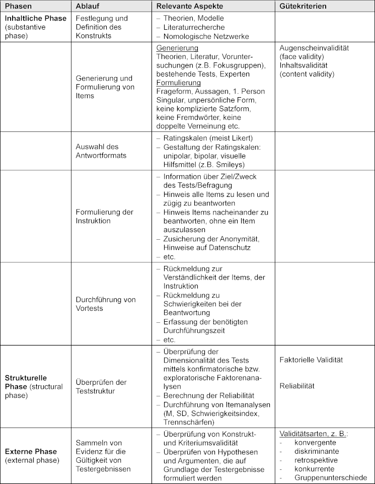 Die Konstruktion von Tests bzw. Fragebögen setzt ein gut definiertes Konstrukt oder zumindest einen konkret beschriebenen Konstruktraum voraus. Auf dieser Grundlage können Items formuliert werden, die inhaltlich valide und gut verständlich sein müssen und sich an den Zielen des Verfahrens orientieren. Hat sich das Verfahren in Vortests an kleinen Personengruppen bewährt, können seine strukturellen (Dimensionalität) und weiteren psychometrischen (Reliabilität, Validität etc.) Eigenschaften anhand von umfangreicheren Datenerhebungen überprüft werden. Um die Validität der Testergebnisse zu bestimmen, müssen verschiedene Aspekte berücksichtigt werden. Diese beziehen sich vor allem auf das zu messende Konstrukt und seine theoretische Einbettung sowie seine Beziehung zu anderen Variablen, aber auch auf den Kontext der Messung und die Konsequenzen, die aus den Testergebnissen abgeleitet werden.