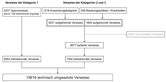 Auf Basis dieser Regeln erfolgte anschließend die Kartierung aller als Text vorliegenden Verweise. Hierzu wurde der Katalog kapitelweise zur Reduktion der Arbeitslast unter den Autoren TR und SD aufgeteilt. Es wurde bei jeder QV festgehalten, ob es sich um eine originale QV handelte (Verweiskategorie 1), um ein vorheriges Anwendungsbeispiel (Verweiskategorie 2) oder einen vorherigen Eintrag bei „Beratungsanlass/Krankheit“ (Verweiskategorie 3). Schritt 1 wurde vor Beginn der Kooperation mit dem MFT vom LOOOP-Forschungsteam durchgeführt, die so ergänzte NKLM-Version wird nachfolgend als NKLM 1.0 (neo) bezeichnet [https://nklm-10-neo.looop-network.org].