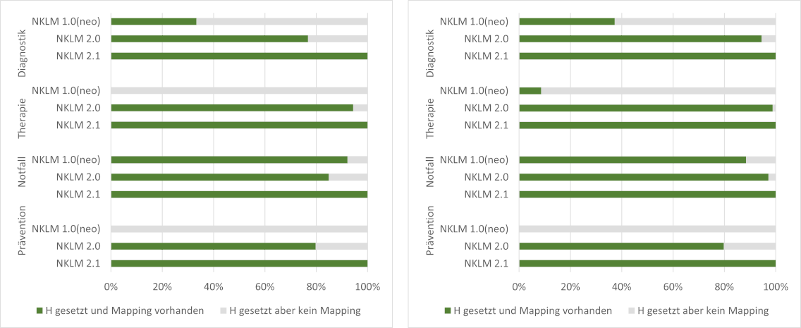 Ergänzend ist in Abbildung 7 [Abb. 7] erkennbar, dass innerhalb des NKLM 2.0 nicht nur viele QV in die Zielkapitel trotz gesetzter Deskriptoren gänzlich fehlten, sondern dass auch bei existierenden QV oft eine hinsichtlich Kongruenz mit dem Deskriptor erforderliche Tiefe H nicht erreicht wurde. Beide Punkte sind im NKLM 2.1 inzwischen zu 100% korrekt abgebildet.