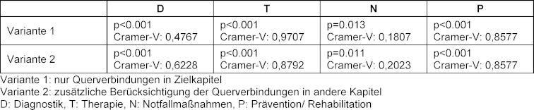 Die QV zwischen den Kapiteln des NKLM 1.0 bzw. NKLM 1.0 (neo) sind in Abbildung 2 [Abb. 2] aufgetragen. Es zeigt sich eine deutliche Steigerung der Dichte der (ebenfalls bidirektionalen) QV, wobei sich im Chi-Quadrat-Test auch im NKLM 1.0 (neo) weiterhin eine inhomogene Verteilung findet. NKLM 1.0: p<0,001/Cramer-V: 0,513, NKLM 1.0 (neo): p<0,001/Cramer-V: 0,387.