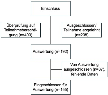 Insgesamt füllten n=192 Studierende den Fragebogen aus; 37 dieser Fragebögen wurden aufgrund fehlender Angaben nicht in die Auswertung einbezogen (siehe Abbildung 1 [Abb. 1]). Somit lagen vollständige Datensätze für n=155 Studierende vor. Alle Teilnehmenden gaben ihr schriftliches Einverständnis durch das Absenden des ausgefüllten Fragebogens. Die Studierenden verteilten sich gleichmäßig auf alle Semester des Studiengangs.