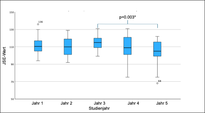 Abbildung 2: Boxplot der Empathiewerte (Jefferson Scale of Empathy, JSE) nach Studienjahr; ein signifikanter Unterschied ist zwischen Studierenden des dritten und fünften Studienjahres erkennbar.