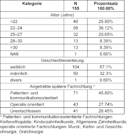 Von den 155 Teilnehmenden waren 104 (67,1%) weiblich, 50 (32,3%) männlich und eine Person (0,6%) ordnete sich der Kategorie „divers“ zu (siehe Tabelle 2 [Tab. 2]). Auf die Frage nach den beruflichen Zukunftsplänen im zahnärztlichen Bereich gaben 43 Personen (27,74%) an, sich für ein operatives Fachgebiet (z. B. Oralchirurgie) zu interessieren, 71 (45,8%) bevorzugten ein kommunikations- und patientenorientiertes Fachgebiet (z.B. Präventivzahnmedizin), und 41 (26,5%) waren noch unentschlossen. Die Mehrheit der Teilnehmenden (n=96; 61,9%) war jünger als 24 Jahre – dem typischen Alter, in dem das deutsche Zahnmedizinstudium ohne Verzögerungen abgeschlossen wird.