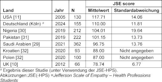 Tabelle 3: Vergleich der mittleren Empathiewerte (JSE) unter Zahnmedizinstudierenden verschiedener Länder.