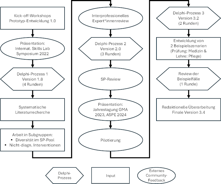 Um die verschiedenen Gesundheitsberufe und die beteiligten Akteure zu berücksichtigen, wurde ein an die Delphi-Methode [18] angelehnter, mehrstufiger Erarbeitungs- und Konsensprozess durch eine 19 Personen umfassende Arbeitsgruppe des Ausschusses „Simulationspersonen“ der deutschsprachigen Gesellschaft für Medizinische Ausbildung (GMA) durchgeführt. Dabei wurden Perspektiven und Erfahrungen von externe Expert*innen integriert [19]. Die aufgeführten 5 Schritte wurden nacheinander ausgeführt und die Zwischenstände in der interprofessionell und international besetzten Arbeitsgruppe zusammengeführt und über insgesamt 10 Runden konsentiert.