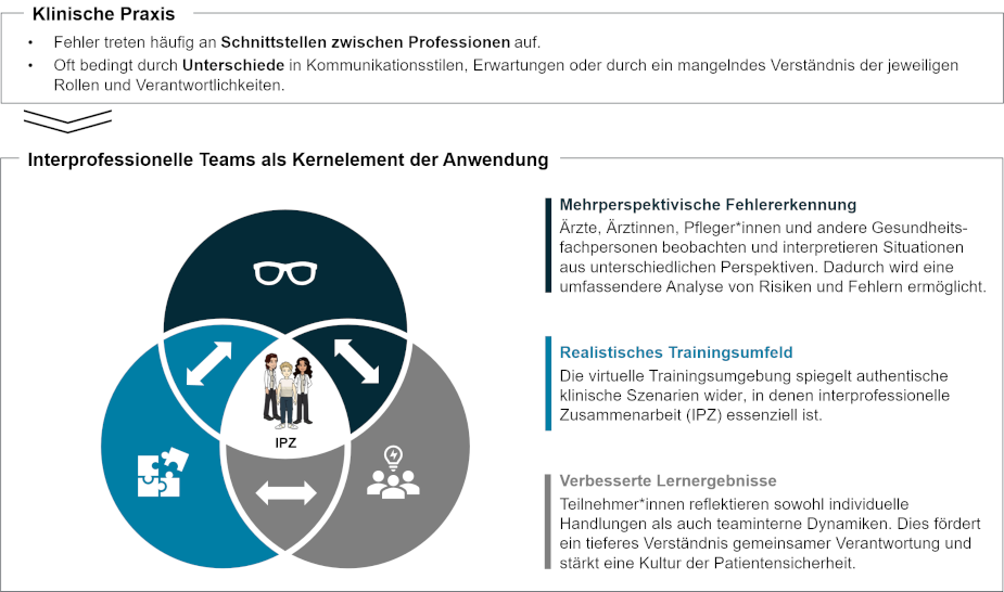 Die Anwendung unterstützt eine skalierbare IPZ, indem sie die Teilnahme zahlreicher Teilnehmer*innen ermöglicht, die in mehrere separate Teams eingeteilt werden. Über das Dashboard können Trainer*innen die Teilnehmer*innen automatisch oder manuell professionellen Teams zuweisen, wofür eine Drag-and-Drop-Oberfläche zur Verfügung steht (siehe Anhang 1 [Anh. 1], Teil 14 und 15). Dadurch wird eine optimale fachliche Durchmischung gewährleistet und der administrative Aufwand der Trainer*innen reduziert. Teilnehmer*innen können ihre zugewiesenen Teams unmittelbar einsehen, einschließlich der Namen und beruflichen Hintergründe (siehe Anhang 1 [Anh. 1], Teil 8). Die Zusammenarbeit wird zudem durch ein gemeinsames digitales Notizbuch unterstützt, das der Dokumentation und Diskussion erkannter Fehler dient (siehe Anhang 1 [Anh. 1], Teil 16), ergänzt durch Benachrichtigungen für die Zusammenarbeit in Echtzeit. Insgesamt bilden interprofessionelle Teams das zentrale Element des ROE, da sie eine realitätsnahe Zusammenarbeit und eine umfassendere Gefahrenerkennung über Berufsgrenzen hinweg ermöglichen (siehe Abbildung 3 [Abb. 3]).