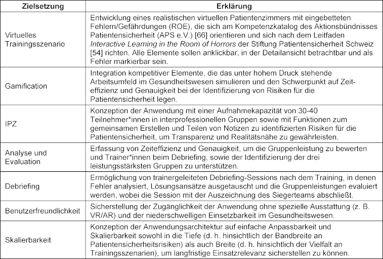 Die Anwendung wurde im Rahmen eines Kooperationsprojekts zwischen der Dualen Hochschule Baden-Württemberg (DHBW) Stuttgart [64] und dem Simulationszentrum STUPS am Klinikum Stuttgart [65] entwickelt. STUPS bietet simulationsbasiertes Training mit Fokus auf Patientensicherheit an und betreibt einen physischen ROE. (siehe Anhang 1 [Anh. 1], Teil 1), in dem Teilnehmer*innen Patientensicherheitsrisiken in einem simulierten klinischen Umfeld identifizieren [54], [55], [56], [57]. Erste Ansätze zur Digitalisierung des Formats – unter Verwendung einer digitalen Bildtafel in Lehrveranstaltungen [https://padlet.com/] (siehe Anhang 1 [Anh. 1], Teil 2) sowie Videokonferenzen zum Debriefing – ermöglichten STUPS praxisorientierte Erkenntnisse über die Potenziale (z. B. verbesserte Zugänglichkeit, Wiederverwendbarkeit und Effizienz der Vorbereitung) sowie die Grenzen digitaler Lösungen, insbesondere in Bezug auf Gruppenzusammensetzung, IPZ, Fehlertracking und strukturiertem Debriefing. Diese Erfahrungen bildeten die Grundlage für die initialen Entwicklungsanforderungen, die in weiteren Diskussionen mit Trainer*innen, Teilnehmer*innen und weiteren Stakeholdern präzisiert wurden. In Übereinstimmung mit Schritt 2 von DSR wurden diese Anforderungen in konkrete Ziele für die Anwendungsentwicklung überführt (siehe Tabelle 1 [Tab. 1]), die als Grundlage für die Erstellung einer digitalen, simulationsbasierten Anwendung zum Training und Debriefing von SB in interprofessionellen Teams dienten.