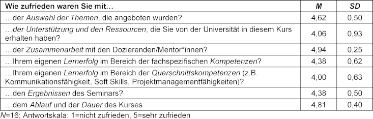 Die Freitextantworten wurden thematisch mittels MaxQDA Version 24 [19] geclustert. Die sieben geschlossenen Fragen eruierten „Zufriedenheit mit Seminarthemen“, „erhaltende Unterstützung“, „Zusammenarbeit mit Dozierenden/Kommilitoninnen“, „Lernerfolg zu fachlichen Kompetenzen“, „Lernerfolg zu Querschnittskompetenzen“, „Zufriedenheit mit Seminarergebnissen“ und „Zufriedenheit mit Ablauf und Dauer des Kurses“.