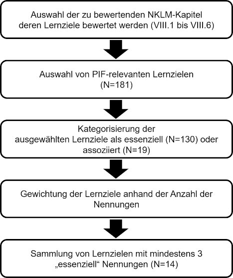 Die Lernziele der ausgewählten NKLM-Kapitel (N=532) wurden allen Mitgliedern der UAG in einem bearbeitbaren Format (Excel-Datei) zur Verfügung gestellt. Zunächst wählten die einzelnen Expert*innen (N=6) jede(r) für sich aus diesen 532 Lernzielen jeweils die aus ihrer Sicht grundsätzlich für die PIF relevanten Lernziele aus. Die individuell ausgewählten Lernziele wurden in einer weiteren Excel-Tabelle zusammengeführt. So entstand eine Sammlung von Lernzielen (N=181), die aus Sicht der Expert*innen grundsätzlich als für PIF relevant erachtet werden.