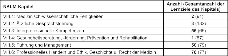 Tabelle 1: Anzahl der als relevant eingestuften Lernziele des Nationalen Kompetenzbasierten Lernzielkatalogs Medizin (NKLM, Version 2.0) zu den übergeordneten Kompetenzen für das Medizinstudium (Kapitel VIII.1 bis VIII.6).