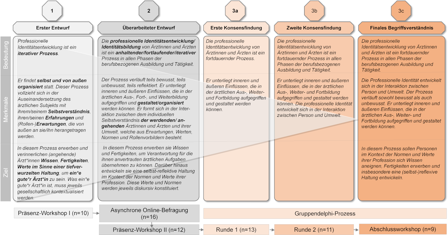 Als Resultat des beschriebenen mehrstufigen Prozesses konnte Konsens über die folgende Begriffsbestimmung gefunden werden: „Die professionelle Identitätsentwicklung von Ärzt*innen ist ein fortdauernder Prozess in allen Phasen der berufsbezogenen Ausbildung und Tätigkeit. Die professionelle Identität entwickelt sich in der Interaktion zwischen Person und Umwelt. Der Prozess verläuft sowohl bewusst als auch unbewusst. Er unterliegt inneren und äußeren Einflüssen, die in der ärztlichen Aus-, Weiter- und Fortbildung aufgegriffen und gestaltet werden können. In diesem Prozess sollen Personen im Kontext der Normen und Werte ihrer Profession sich Wissen aneignen, Fertigkeiten erwerben und insbesondere eine (selbst-) reflexive Haltung entwickeln.“