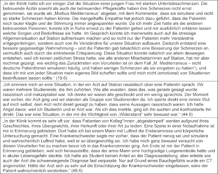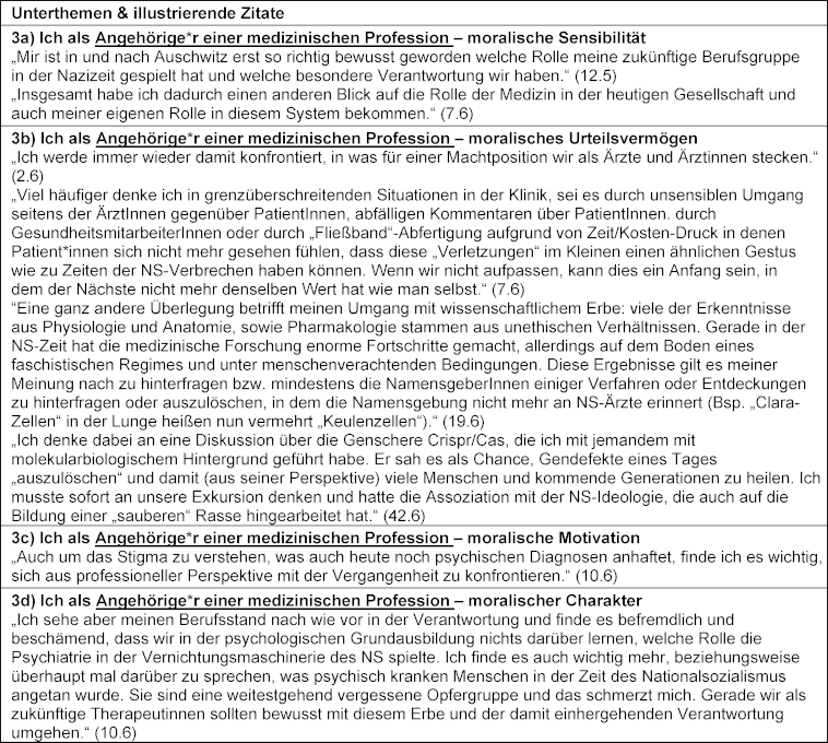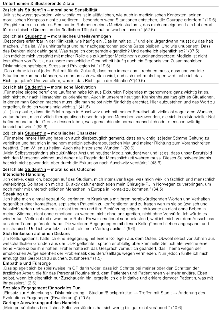 Die Studierenden beschrieben eine gesteigerte moralische Motivation, so moralischen Werten Vorrang einzuräumen, z. B. „Immer wenn ich eine/n neue/n Patient*in Kennenlernen probiere ich sie ohne Vorurteile und mit offenen Herzen und offener Wahrnehmung kennenzulernen.“ (50.6), sowie Aspekte des moralischen Charakters, um für diese Werte einzutreten: „(...) Die Exkursion hat mir jedoch die Wichtigkeit dieser Werte noch einmal gezeigt sowie, dass sich stark machen für diese.“ (44.6). Die Studierenden berichteten auch über intendiertes Handeln als zukünftige Ärzt*innen bzw. Psycholog*innen: „Außerdem habe ich mir das Ziel gesetzt, im Zuge meiner beruflichen Laufbahn in Krisengebiete zu reisen und dort medizinische Versorgung für Notleidende anzubieten.“ (41.6) sowie über moralische Outcomes wie Speaking-Up: „Auch im Krankenhaus Alltag leider gibt es immer wieder Situationen in denen „leichte“ Diskriminierung oder Rassismus auftauchen. In solchen Situationen habe ich immer mal wieder meinen Mut zusammengenommen und habe dagegen protestiert.” (41.6) und mehr Fürsorge: „Es gab ein Moment in der Klinik, in dem ein Arzt sehr unfreundlich und grob zu einer Patientin war, dies ging mir sehr nah. Ich fühlte ein starkes Gefühl der Ungerechtigkeit und dachte ich sollte etwas dagegen unternehmen. Als der Arzt aus dem Zimmer ging und ich mit der Patientin zurückblieb, entschuldigte ich mich bei der Pat. und versuchte ihr ein paar mitfühlende Worte mit auf dem Weg zu geben. Ich schaffte es zwar nicht den Arzt auf dein Fehlverhalten hinzuweisen (…) aber zumindest schaffte ich es in der Situation nicht völlig tatenlos zu bleiben.“ (7.6) (siehe auch Tabelle 3 [Tab. 3]).