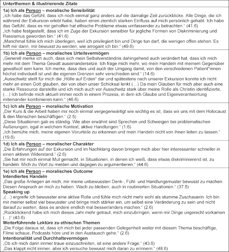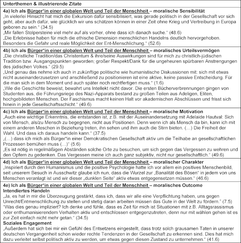 Im Rahmen eines moralischen Urteilsvermögens verglichen sie historische Ereignisse mit aktuellen Herausforderungen: „Manchmal erwische ich mich, wie ich Ereignisse aus der Gegenwart mit dem vergleiche, was wir in Ausschwitz gesehen haben. Ich finde diese Vergleiche, die ja auch in den Medien (…) gerne gezogen werden eigentlich schwierig und doch hilft es mir Prinzipien anzunehmen und eine Meinung zu bilden.“ (48.6). Die Auseinandersetzung mit dem Holocaust führte bei einer Person dazu, dass sie persönlich wichtige Werte, darunter auch ihren religiösen Glauben, in Frage stellte: „Auch mein naiver religiöser Glaube in einem paternalistischen liebenden Gott wurde erschüttert. (…) Da mein Glauben für mich aber auch eine starke Ressource darstellte (…), hinterließ Ausschwitz auf spiritueller Ebene ein dunkles Loch und führte mich in eine Identitätskrise.“ (46.6). Die Bedeutung der Priorisierung moralischer Werte wurde als starker Sinn für moralische Motivation zum Ausdruck gebracht: „Angst machen hat so eine große Macht. Deshalb finde ich es sehr wichtig, dass man zu seinen Werten steht und nicht immer mitmacht, was die Gruppe macht oder sagt.“ (40.6). Die Bedeutung von moralischem Charakter wurde unter Bezugnahme auf Zivilcourage zum Ausdruck gebracht: „Ich habe vor allem festgestellt, dass mein innerer Mut mich für diese Dinge einzusetzen gestiegen ist.“ (7.5), ebenso wie Ich-Stärke: „Diese Exkursion ist ein weiterer Stein in meiner inneren Mauer gegen den Faschismus, gegen den Angriff auf die Würde des Menschen.“ (49.6) und Verantwortung: „Auch ein gewisses Verantwortungsgefühl, auch für Situationen, an denen ich vielleicht nicht direkt selber beteiligt war, in denen es aber zu Ungerechtigkeiten kam, habe ich beobachtet.“ (43.6). Es wurde auch eine Bestärkung der eigenen Haltung zum Ausdruck gebracht: „Meine Haltung gegen Rassismus und Verfolgung war vorher schon vorhanden, hat sich durch den Besuch in Auschwitz aber noch bekräftigt“ (24.6).