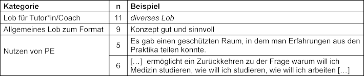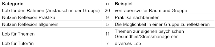 Positiv hervorgehoben wurden die Atmosphäre in den Gruppen, die Tutor*innen, die Reflexion der Praxiseinsätze und die Möglichkeit zur Selbstreflexion, siehe Tabelle 2 [Tab. 2].
