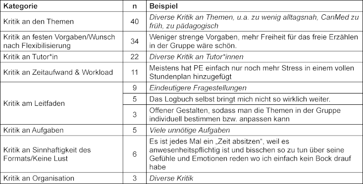 Die Zufriedenheit mit dem PE-Pfad in den ersten Jahren des Studiengangs waren sehr uneinheitlich, mit großen Schwankungen zur Bewertung des Formats (Schulnoten 2,3-3,6) und der Tutor*innen (1,8-3,8) zwischen Modulen und Kohorten (siehe Anhang 1 [Anh. 1]). Aufgrund der bereits geschilderten, wechselnd gestalteten Fragebögen ist eine zusammenfassende Auswertung der Items über die Jahre nicht möglich. Aus den Freitexten der Jahre 2013-2015 (371 Freitextkommentare) lassen sich jedoch Aussagen herausarbeiten. Insgesamt gab es 303 kritische Freitexte und 53 positive Anmerkungen.