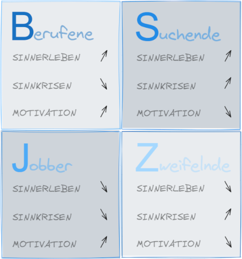 Durch die Gruppierung der Interviews nach Ähnlichkeiten in der Ausprägung des Sinnerlebens konnte ein Zusammenhang zwischen Motivation, Sinnerleben und -krisen herausgearbeitet werden. Je nach Ausmaß des Sinnerlebens und -krisen resultierten vier Typen, die sich auch in ihrer Motivation unterschieden: die Berufenen, die Jobber, die Suchenden und die Zweifelnden. Abbildung 1 [Abb. 1] zeigt eine visualisierte Darstellung. Tabelle 4 [Tab. 4] enthält exemplarische Zitate für die einzelnen Typen.