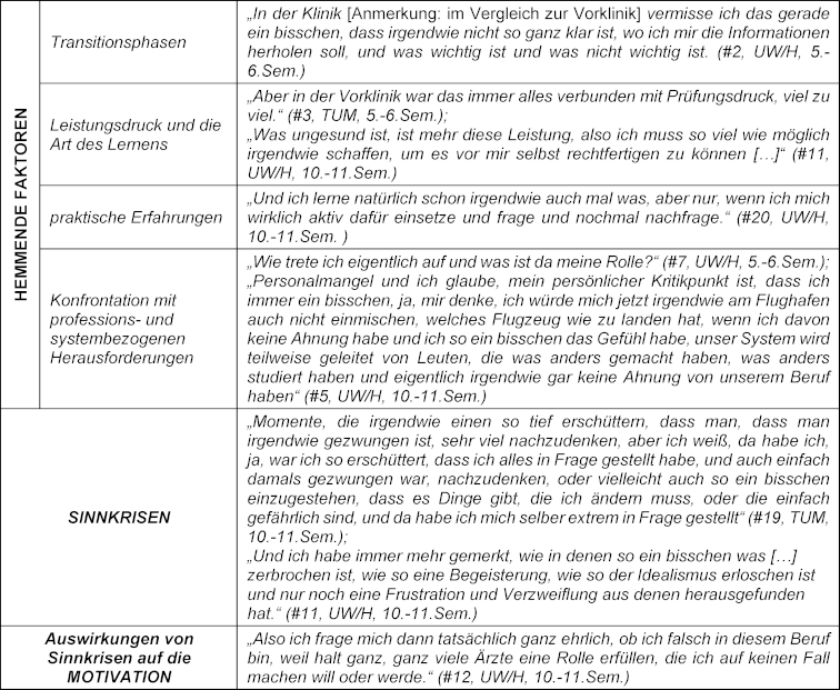 Die Darstellung von Einflüssen, die sich negativ auf das Sinnerleben auswirkten, wurden von uns als hemmende Faktoren des Sinnerlebens kategorisiert. In den meisten Fäll riefen sie eine bewusste Auseinandersetzung mit Sinnfragen hervor und konnten eine Sinnkrise auslösen, die durch ein krisenhaftes Erleben und durch eine bewusste Auseinandersetzung mit Sinnfragen definiert war. Vier Kategorien von hemmenden Faktoren ließen sich identifizieren: Einerseits konnten Transitionsphasen, wie die Entscheidung für ein Studium, zu einem negativen oder sogar krisenhaften Erleben führen, da diese häufig mit einer „Orientierungslosigkeit“ (#3) und „Zukunftsängsten“ (#3) einhergingen. Weiterhin waren Übergänge in neue Ausbildungsphasen von spezifischen Ungewissheiten geprägt. Beispielsweise funktionierten Lernstrategien nach dem Physikum aufgrund der höheren Stoffmenge nicht mehr.