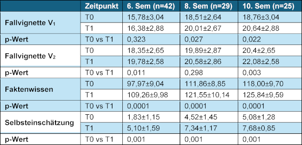 Bei der Fallvignette V1 konnte bei Studierenden des achten (p=0,027) und des zehnten Semesters (p=0,022), nicht jedoch bei den Studierenden des sechsten Semesters (p=0,323) ein signifikanter Lernzuwachs erzielt werden (siehe Tabelle 1 [Tab. 1]). Es konnte kein signifikanter Unterschied zwischen den einzelnen Semestern beobachtet werden (p=0,203). Bei der Fallvignette V2 zeigte sich ein signifikanter Lernzuwachs beim sechsten (p=0,011) und beim zehnten Semester (p=0,003), nicht jedoch beim achten Semester (p=0,298). Auch hier konnte kein signifikanter Unterschied zwischen den Semestern nachgewiesen werden (p=0,256).
