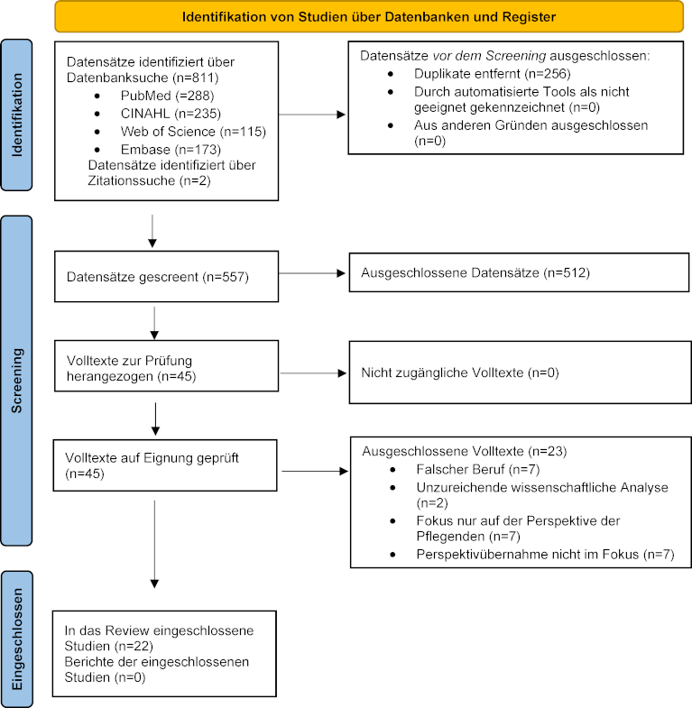 Insgesamt wurden 22 Studien in diesen Review eingeschlossen. Der Auswahlprozess ist als PRISMA-Flussdiagramm in Abbildung 1 [Abb. 1] dargestellt [18]. Über die vier Datenbanken wurden insgesamt 811 Datensätze identifiziert, zwei weitere Quellen wurden durch Citation-Tracking ergänzt. Nach der Duplikatentfernung wurden Titel und Abstracts anhand der Ein- und Ausschlusskriterien gescreent. Anschließend erfolgte die Volltextprüfung potenziell relevanter Studien.