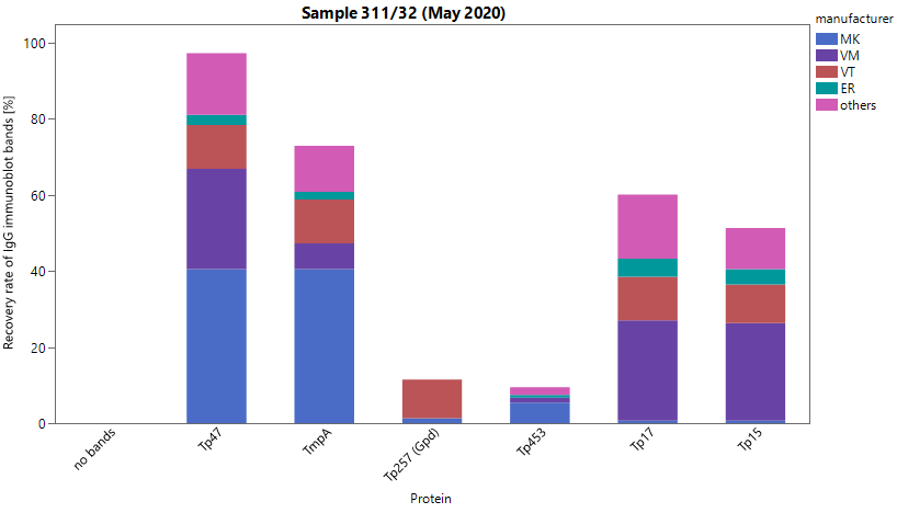 Figure 3: Manufacturer-specific distribution of immunoblot bands for sample 32 (IgG and IgM)
