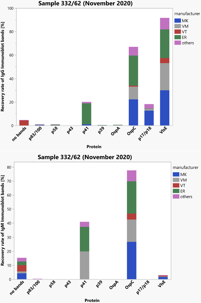 Figure 4: Manufacturer-specific distribution of immunoblot bands for sample 62 (IgG and IgM)